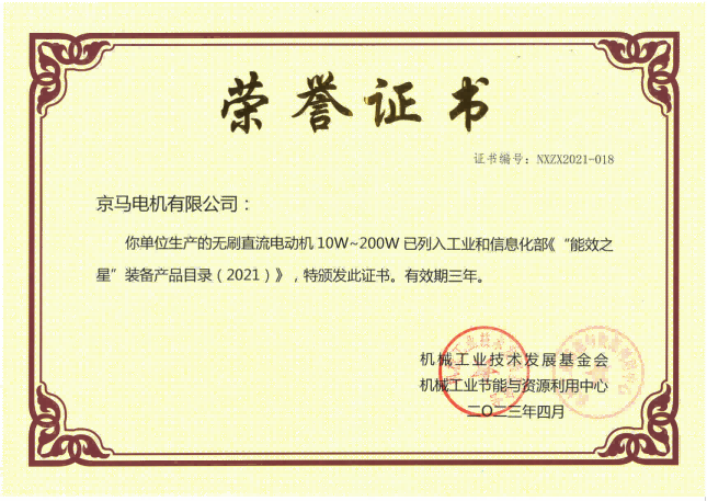 4月,京馬電機(jī)榮獲《國(guó)家“能效之星”裝備榮譽(yù)證書(shū)》。
